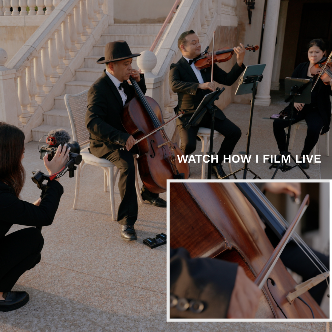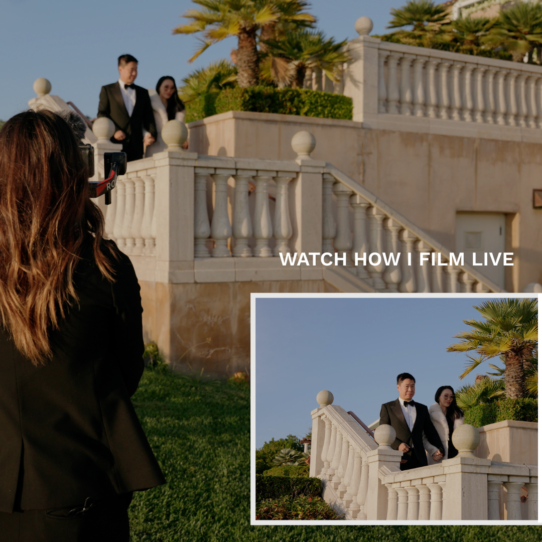 Before we get to the live filming, I’ll also walk you through how I prepare behind the scenes: from what I research and ask the planning team and the couple beforehand, to how I coordinate with my team and communicate our plan leading up to the wedding weekend. Then you’ll see it all come to life as I film in real time during a real wedding day.